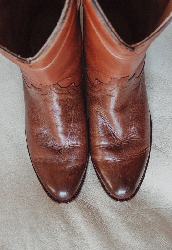 Contemporary second-hand cognac Tecovas, Earl roper boots, men's size 9.5 EE. Beautifully made in a deep rich bourbon color, super soft, hand-burnished calfskin. Soft rounded toe. In overall excellent condition, with some minor scuffs and scratches. They also appear to have had one of the boot pulls mended, but whoever did the repair did a great job because it's almost not even noticeable, please see all photos.